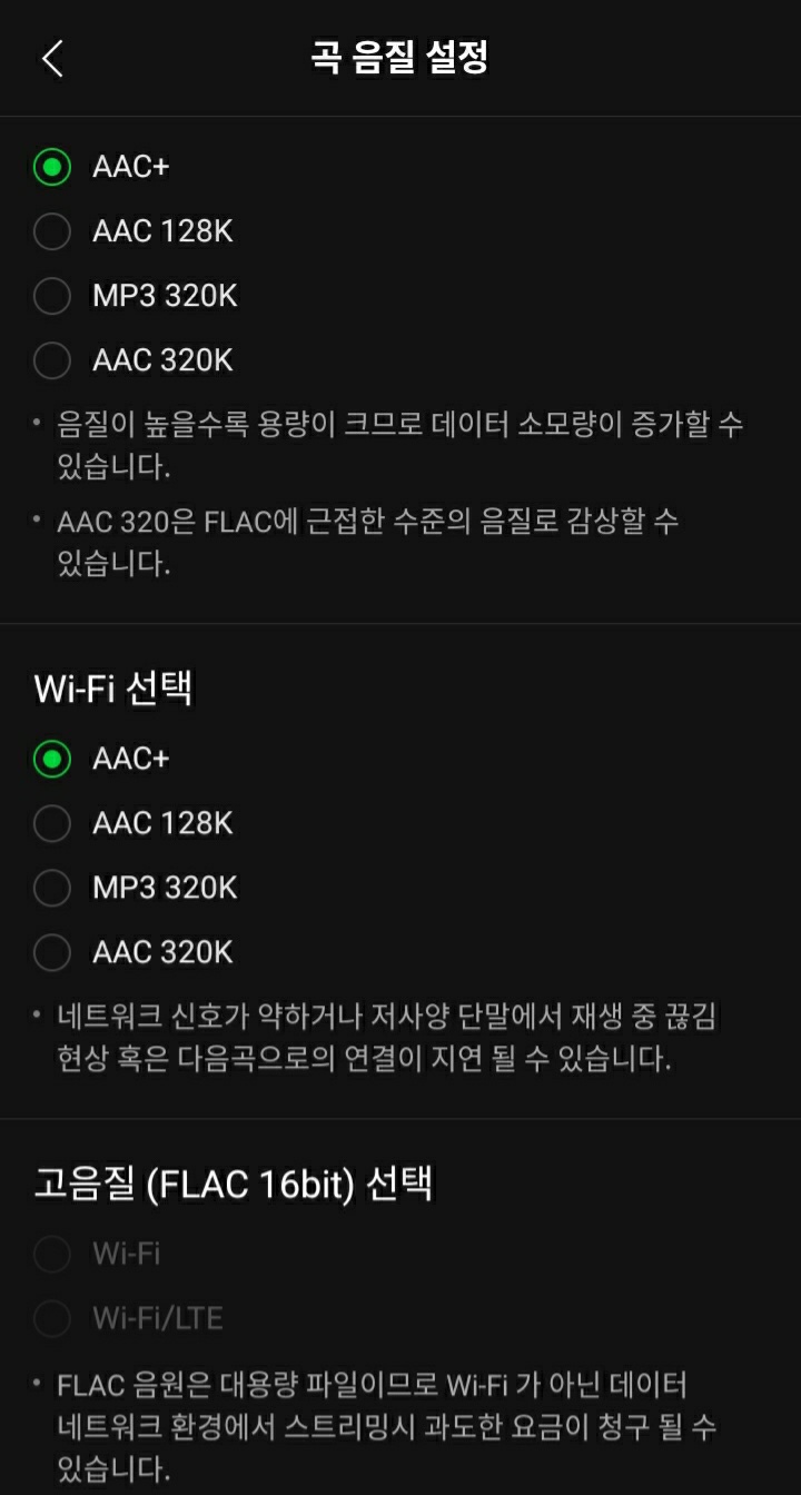 즉 고음질 파일이더라도 블루투스로 들으면 AAC+ 음질로 재생되고, 일반 데이터 요금제에서 스트리밍 재생시에도 AAC+ 음질이기에 고음질로 음악 감상을 하시려면 고음질 데이터 요금제에 가입하셔서 음질을 320kbps나 FLAC을 선택하셔서 들으셔야 합니다. 아니면 결국 USB나 애플 카플레이, 안드로이드 오토로 유선 연결해서 들어야겠네요.
