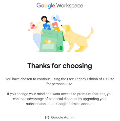Personal use: stay on no-cost Legacy G Suite 옵션을 선택